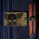 Un crâne menaçant avec des ailes et deux lézards rampant là-dessus sur un fond des formes et des flocs.