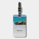 Une étiquette de bagage avec une belle photo. Une plage de sable blanc, au surf doux. Une eau tropicale turquoise entoure un rocher déchiqueté.