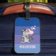 Une étiquette de bagage adorable pour tous les amoureux de les chats. Il comporte quatre bandes de différentes nuances bleues et une tabby gris et noir portant un béret vous faisant embrasser et embrasser. Personnalisez avec un nom et il sera à vous. © ArianeC Illustrations-Tous droits réservés