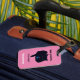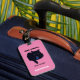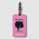 Black cat Cleo sur une étiquette en acrylique rose à un côté. Texte sur le devant personnalisable et personnalisable avec votre nom. Le dos porte la fente de carte pour l'adresse de nom, etc.