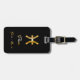 Élégante étiquette à bagages avec pinces d'or sur arrière - plan noir.