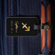 Élégante étiquette à bagages avec sagittarius or signe sur arrière - plan noir.