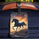 Wild desert black stallion running in a lightning storm, with colorful skies, full of stars and nebulae