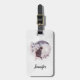 Une étiquette bagage avec un tableau aquarelle d'un chat noir et un bouquet floral violet clair et rose. Devant une grande lune. Design et magique.