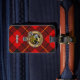 Clan Wallace crête badge entouré d'une sangle et boucle sur l'arrière - plan tartan. Texte personnalisé des deux côtés.