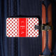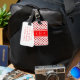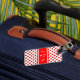 Balise Monogram Luggage avec initiales sur bande rouge avec bordure blanche sur le motif coeur de polka