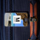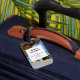 Une étiquette de bagage avec une photo nature pittoresque. Belle mer bleu turquoise avec une plage de sable fin. Une grande roche brune offre de l'ombre du ciel bleu vif.