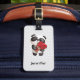 Une étiquette de bagage avec un adorable dessin aquarelle. Un adorable ours de panda noir et blanc portant un bouquet de roses. Gris avec arrière - plan pois blanc.
