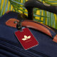 Elégante silhouette de laurier jaune clair sur étiquette bagage rouge bordeaux.