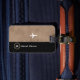 An elegant design, to personalize with the name of the stylish traveler... simulating aged brown leathe background, with silhouette of a plane with dotted line route, and monogram (editable M initial letter).