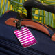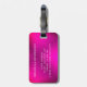 Créez une étiquette de bagage lumineuse avec un design rose et blanc fuchsia. Le texte modèle vous permet de taper facilement votre nom, adresse, téléphone et autres informations de contact. Le côté arrière est en violet avec du texte blanc, les rayures sont sur le côté avant seulement.