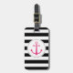 Étiquette rayée noire et blanche de bagage avec une ancre rose au centre.