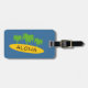 Étiquettes nommées faites sur commande de bagage de voyage de thème de surf. Étiquettes personnalisés de bagages pour des sacs et des valises. Ajoutez votre propre nom, citation drôle ou dire comme Aloha ! Accessoires mignons pour des vacances, des voyages et des lunes de miel. Planche de surf et illustration tropicale de palmier. Couleur faite sur commande d'arrière - plan. Approprié aux femmes et aux enfants des hommes. Thème de surfer. En outre gentil pour des jeunes-mariés, des retraités retraités et juste marié épousant des couples.