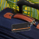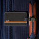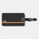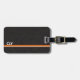 Un style classique d'un arrière - plan en cuir noir et un simple monogramme avec une ligne orange et une bande blanche plus petite. Pour la personne qui veut un look simple mais aime une façon facile d'identifier ses bagages sans révéler toutes ses informations. Design original par Night Owl's Menagerie, 2023.