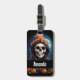 Une étiquette de bagage avec l'illustration d'un squelette portant une veste à capuchon avec un casquette de sorcière orange au-dessus. Entouré de citrouilles mignons et éffrayants. Une lune brillante dans le dos avec une seule chauve-souris volant à proximité. Fun automne design Halloween.