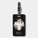 Une étiquette de bagage avec l'illustration d'un fantôme souriant. Décoré de fleurs, arcs-en-ciel et chauves-souris.