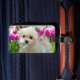Caractéristiques du produit ce Hermes, un petit chiot maltais doux se tenant parmi quelques belles tulipes de ressort.