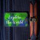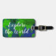 Les étiquettes faites sur commande de bagage de carte du monde avec le voyage citent. Conception vintage de globe de la terre de planète avec le modèle élégant de typographie de brosse. Explorez le monde, votre aventure attend ! Étiquettes personnalisés pour des sacs et des valises. Idée mignonne de cadeau d'anniversaire pour le voyageur et l'explorateur internationaux. Ajoutez votre adresse sur le dos ou ajoutez un carte de visite. Inclut le bracelet en cuir pour l'attachement.