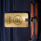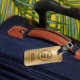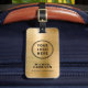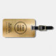 Marque de bagage professionnelle moderne avec le logo de votre entreprise ou de votre organisation et le code QR sur un faux arrière - plan métallique or. Ajoutez votre nom et votre titre dans une simple typographie.