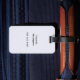 Une étiquette de bagage avec une illustration mystique. Une lune bleu foncé avec un contour élégant en cercle mince et des fleurs blanches fleurissent le long de ses bords.