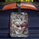 This oil painting by Amanda Diehl features an intricate Venetian mask with elaborate gold and silver details adorning the playful, curly fins of the joker's hat and collar. The mask smiles gaily against a red velvet backdrop.