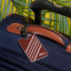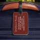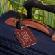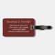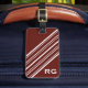 Un arrière - plan rouge cerisier foncé avec des rayures diagonales blanches au centre de l'étiquette. Avant de la balise a un monogramme personnalisable tandis que arrière de la balise a le nom et les champs d'informations de contact.