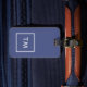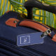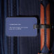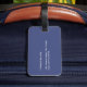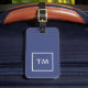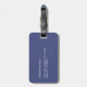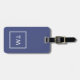 Élégante étiquette de bagage bleu personnalisable avec cadre blanc et monogramme gras.