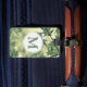 Marque à bagages personnalisée avec l'image estivale du soleil brillant à travers les feuilles d'érable vert avec une citation inspirante de John Muir "Dans chaque marche avec la nature on reçoit beaucoup plus qu'il ne cherche" à l'envers.