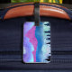 Un paysage abstrait avec des couleurs et des textures uniques montrant une scène de montagne avec des arbres et brouillard dans les tons violet, bleu, turquoise et cyan.