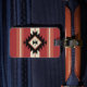 Aztec ethnic bohemian pattern with geometrical shapes in red, orange, grey and black colors on striped background