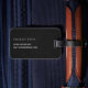 Impression en faux cuir noir comme arrière - plan. Personnalisez et ajoutez vos lettres monographiques et votre nom complet sur le devant. Vos coordonnées au verso. Texte blanc.