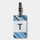 Cette étiquette à bagages présente des rayures colorées de différentes nuances de bleu et de gris. Il comporte également une lettre initiale de nom personnalisée en caractères gras dans une zone de couleur plus claire (avec quelques bords courbés) à l'avant, et des informations de contact personnalisées à l'arrière.