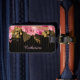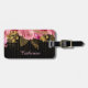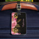 Cette jolie étiquette à bagages présente une rose rose et une image de bouquet doré sur un arrière - plan noir dramatique. Descendre du bouquet est l'image d'un minuscule rideau de perles dorées. En bas se trouve votre nom ou autre texte personnalisé en rose clair. Le dos de la balise est noir avec votre texte personnalisé en blanc.