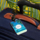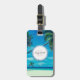 Marque de bagage personnalisée avec un cercle nautique avec votre nom et votre initiale à l'intérieur. Conçu avec une photo à thème tropical avec des cocotiers s'étendant sur une plage de sable blanc isolée. Eaux turquoise et ciel bleu azur en arrière - plan.