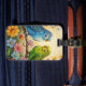 Cute luggage tag for bird lovers with impasto painting style blue and green parakeets and flowers.