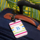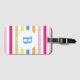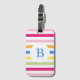 Rainbow colored candy stripes on monogrammed luggage tag.