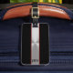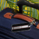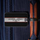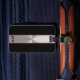 Sur le dos, vous pouvez ajouter votre nom et numéro de téléphone, ce qui pourrait être utile si vos bagages se perdent. A l'avant, le motif a des rayures verticales. De gauche à droite, les rayures sont une épaisse bande noire, une mince bande rouge foncé, une épaisse bande métallique, une mince bande rouge foncée et une épaisse bande noire. Vous pouvez ajouter votre monogramme au bas de la bande qui ressemble à du métal brossé. Tout le texte est noir et peut être modifié.