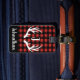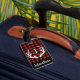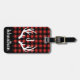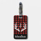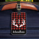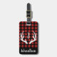 Le buffle rustique vérifie plaid en rouge et noir avec une étiquette de bagage silhouette en bois de cerf blanc avec nom personnalisé en écriture.