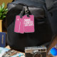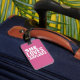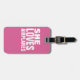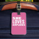 A fun and feminine typographiy design with bold white text 'SHE LOVES AIRPLANES' in a pink-tag, and with additional information at the back... for a woman who is a frequent flyer