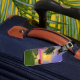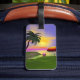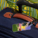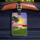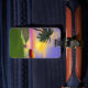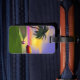 Marque bagage avec mon oeuvre d'une île tropicale verte avec un palmier, un parasol coloré, un ballon de plage et un soleil jaune dans le ciel bleu avec une touche de rose à l'horizon.