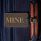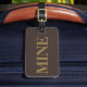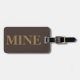 Marque de bagage avec nom et adresse avec un bronzage "MINE" sur une couleur arrière - plan brune. Personnalisez avec votre nom et vos informations d'adresse en utilisant les modèles faciles.