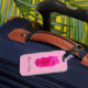 Luggage Tag, With a Beautiful Picture of Triple Pink Roses, on the front of it, ( With the Background removed )= ( Picture by P.J.M.) With a Color Pink Background.