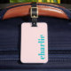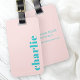 Marque de bagage moderne et minimale avec votre nom personnalisé ou texte aligné verticalement à droite sur un arrière - plan rose clair.