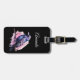 Une étiquette à bagages avec l'image d'un corbeau noir aux ailes violettes roses. Une aquarelle rose derrière cet oiseau mystique.