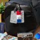 Ce design présente un motif parisien. L'arrière - plan a un fond gris avec une moitié supérieure bleue, blanche et rouge. Au-dessus, une superposition d'art noir, d'éléments parisiens. Le texte à l'avant peut être customisé. À l'arrière, il y a une zone qui peut être customisée avec vos informations. Cette conception est disponible avec trois choix d'arrière - plans.