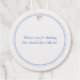 Cette élégante feuille d'or, en forme de cercle mariage anniversaire merci design a une bordure pointillée délicate qui rappelle les anneaux de mariage milgrain. Le devant de cette étiquette de faveur a les mots 50ème anniversaire du Mariage, vos noms, et la date de votre anniversaire de mariage — en feuille d'or véritable. Le dos de cette étiquette de faveur a votre message de remerciement personnel est une police de script bleu clair. La couleur bleu clair de la bordure et du texte peut être customisée pour correspondre à la couleur de votre thème anniversaire mariage. Facile à personnaliser. Coordonner les éléments disponibles.