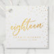 L'effet de parties scintillant en or brillant étoiles scintillent sur les confettis autour de ces belles marques de faveur blanc et or dix-huitième anniversaire, avec un script en feuille d'or lisant, "dix-huit". Parfait pour une soirée chic et chic ! Oeuvre originale de Colleen Michele. Le dos a un motif étoilé contre un arrière - plan noir velouté.