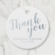 Script moderne Mariage Merci argent Foil Favor Tags fonction titre en feuille d'argent police de script moderne avec nom et date dans la police sans serif moderne sur arrière - plan blanc.