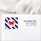 Étiquette de adresse illustrant une illustration d'un crabe rouge et d'un arrière - plan rayé bleu et blanc. Personnalisez avec votre adresse et votre nom.