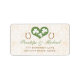 St. Patrick's Day thème shamrock couples douche, fête de fiançailles, douche nuptiale, célébration d'anniversaire ou mariage retour adresse autocollants avec un coeur vert avec des shamrocks blancs à l'intérieur, or look porte-bonheur fer à cheval. Un parchemin crème et blanc d'aspect antique arrière - plan avec un subtil look de dentelle damassé motif rend ce thème irlandais étiquette sur mesure joli et élégant. Ce design moderne et vintage est parfait pour un événement de mars. Il peut être personnalisé avec les noms de la mariée et du marié et leur adresse. Oeuvre © Chrissy H. Studios, LLC. Tous droits réservés.